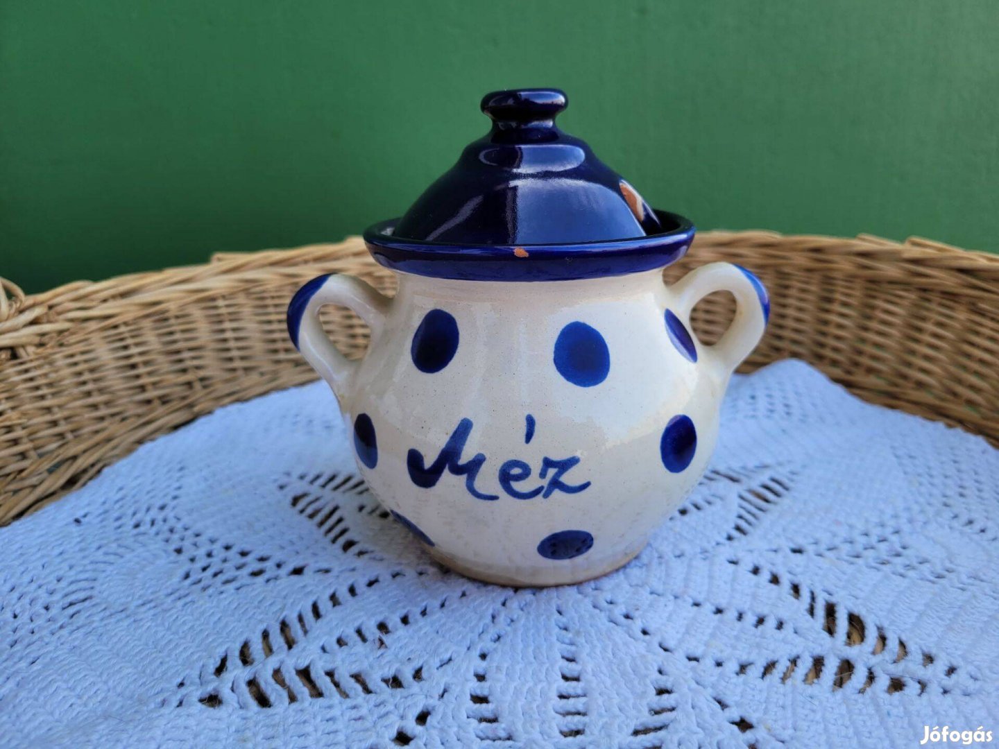 Eladásra kínálom a képen szereplő mázas kerámia méz tartót. A képek magukért beszélnek. Körbe fotóztam. Kézzel festett, szép, szélén kis lepattanás, fotóztam.