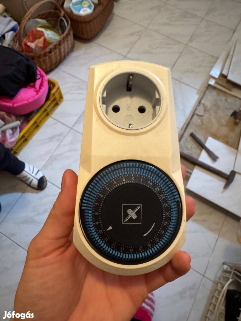 24 órás mechanikus időkapcsoló, közvetlenül konnektorba dugható, schuko aljzattal. Lámpák, fűtőtestek, szivattyúk időzített ki-bekapcsolásához. Régebbi, krém/sárga színű modell, működik, tökéletesen használható.