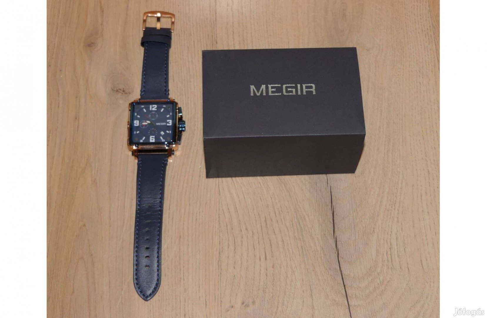 Eladó Megir cronograph stílusú divat óra. Ez is megtetszett, megvettem, használtam, eladó lett. Szögletes elegáns stílusú, nagyobb darab, dátum kijelzés, rózsa arany óratok, kék számlap, kék bőr szíj. Új állapotú, dobozában. Ezt is kb 25000 ft körül vettem.