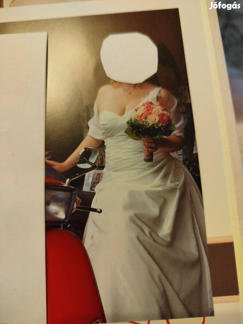 Gyönyörű, tört fehér, selyemhatású, egyszer, esküvőre felvett, a jobb vállat szabadon hagyó, gyöngyökkel kivarrt, a földig hosszított (dán dizájn) menyasszonyi ruha, amelyhez merev tüllel készült, szép tartást biztosító alsószoknya tartozik (vállkendő, virágcsokor nem). A kiváló állapotban levő ruhát zipzáras huzat védi. Számla, garancia nincs meg már. Személyes átvételt szeretnék.