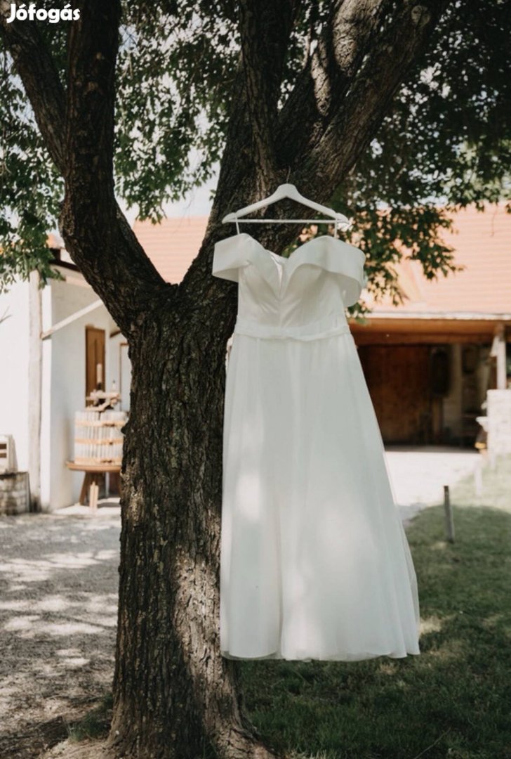Újonnan vásárolt és egyszer viselt ejtett vállú szatén fűzős menyasszonyi ruha, egy extra csillogós tüll réteggel, két zsebbel, kis abronccsal és 3m hosszú gyöngyös fátyollal keresi új tulajdonosát! Frissen tisztított!
