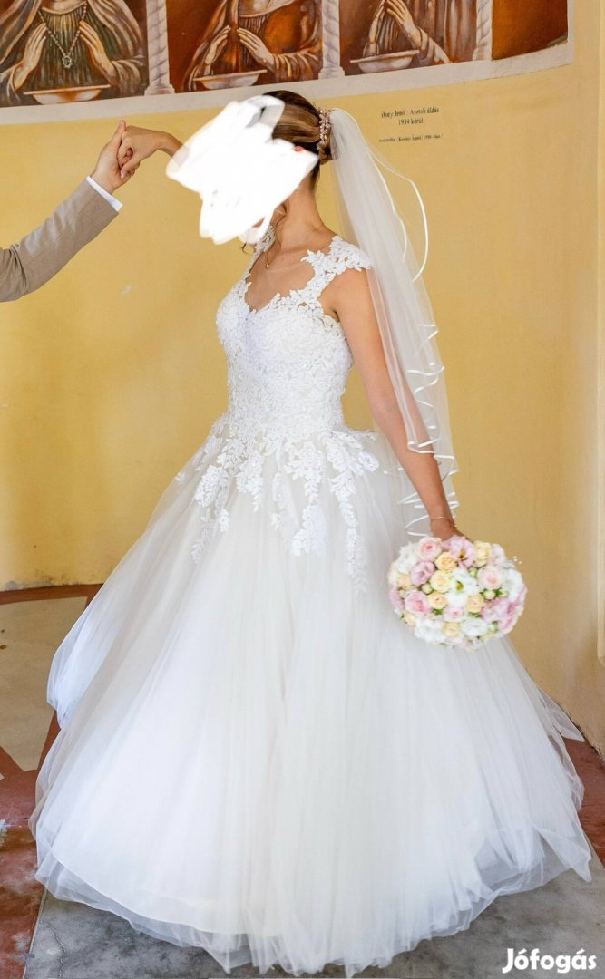 Eladásra kínálom az én álomruhámat. ?Royal ruhaszalonban vásárolt, méretre igazítva: S, színe törtfehér, állapota kiváló. Csipke és gyöngydíszítéses. Háta kivágott, gerinc mentén gombsorral, áttetsző tüll anyag teszi kényelmessé viselését. Uszálya felgombolható.