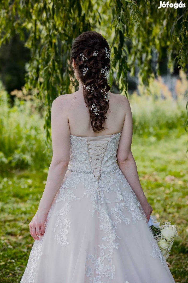 Gyönyörű, púderszínű, virágos csipkével díszített menyasszonyi ruha eladó. Egyszer viselt, professzionálisan tisztított, újszerű állapotban.