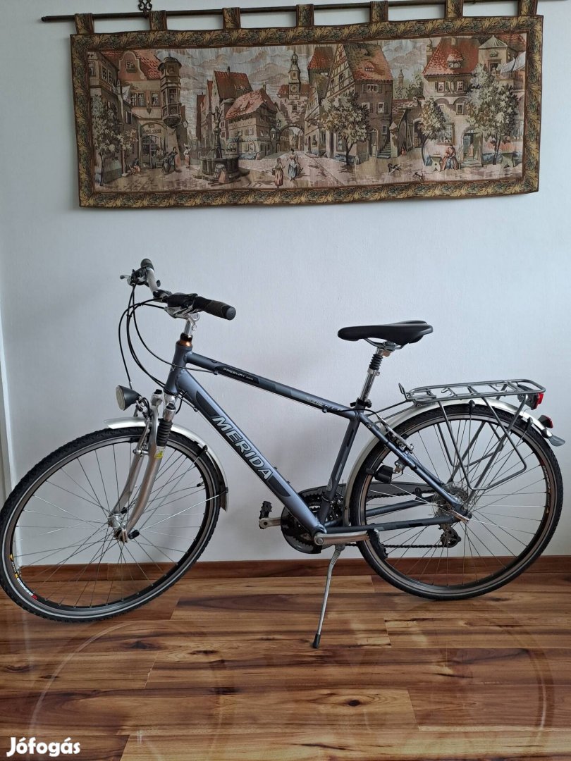 Merida Freeway 9300 trekking férfi kerékpár, Shimano Acera 3x7 sebesség, fék, hajtás, Santour teleszkóp Selle Royal rugós nyereg, csomagtartó, kitámasztó, sárvédő, lámpák, szép állapotban