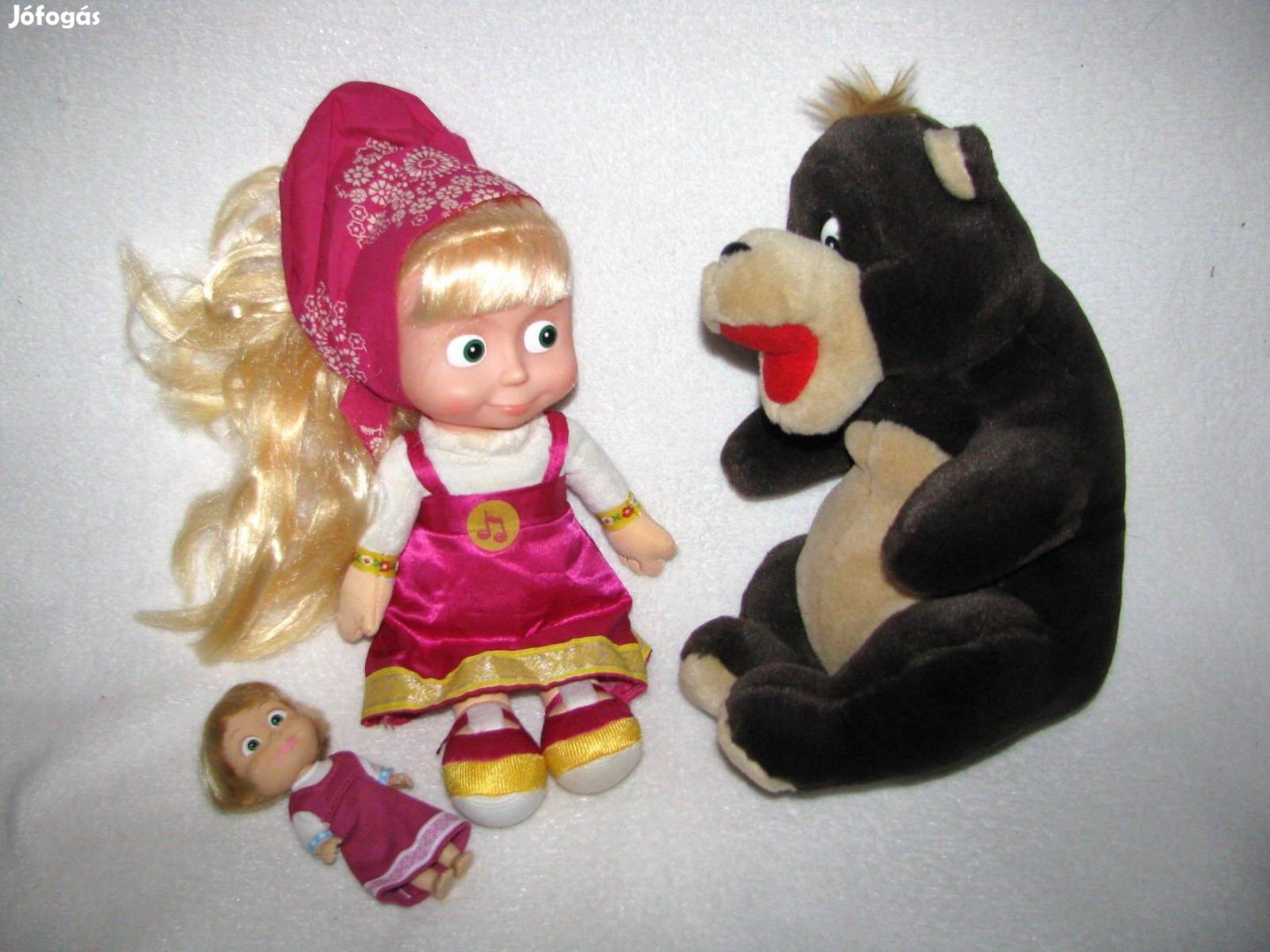30 cm-ek Mása és a Medve mesefigurák és egy kicsi 12 cm Mása ajándékba. Mása hasát megnyomva beszélő . Különlegesen nagy szőke dús hajú a baba. szzemélyesen is, Bp Őrs Vezér térhez közel, bármikor, ha előtte felhív vagy itt kattintson a szívre a kép mellett.