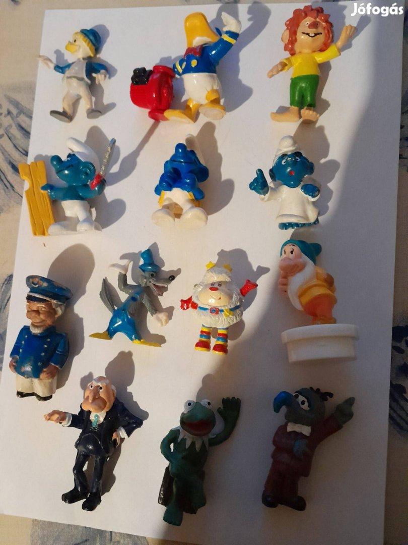 Mesefilmekből műanyag figurák: Donald kacsa, hupikék törpikékből néhány figura, Pumukli, Ede farkas a 3 kismalacból, Szende a hófehérke és 7 törpéből, Twink figura, Gonzo, breki és Statler a Muppet Show-ból, és egy tengerész. Magasságuk 5-7 cm. Áruk darabonként ennyi ezer forint vagy egyben a 13 db 10000Ft.