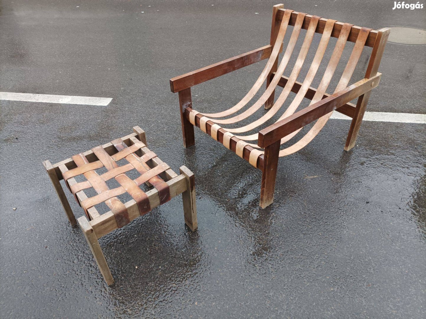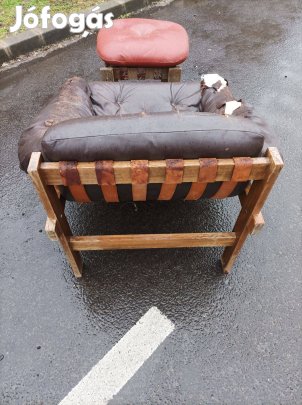 Képek szerint, felújítandó állapotban, extra design az 1960-as évek környékéről, bőr szíjas, bőr kárptizású lounge fotel és hozzátartozó lábtartó, egyben eladó. Lafer style