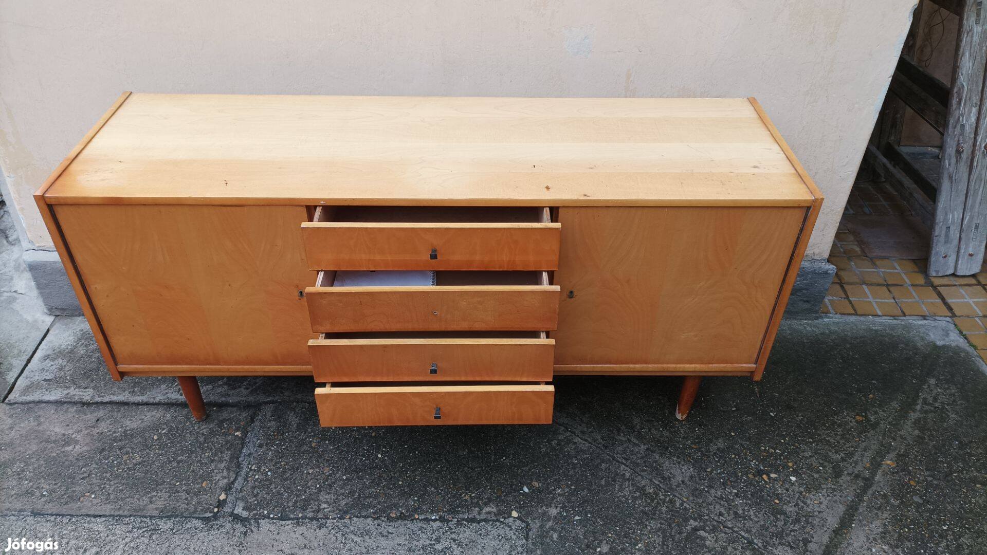 Világos tónusú, két ajtós 4 fiókos 60-as évekbeli bútor, a korának megfelelő használati nyomokkal, lakkozott felületű.