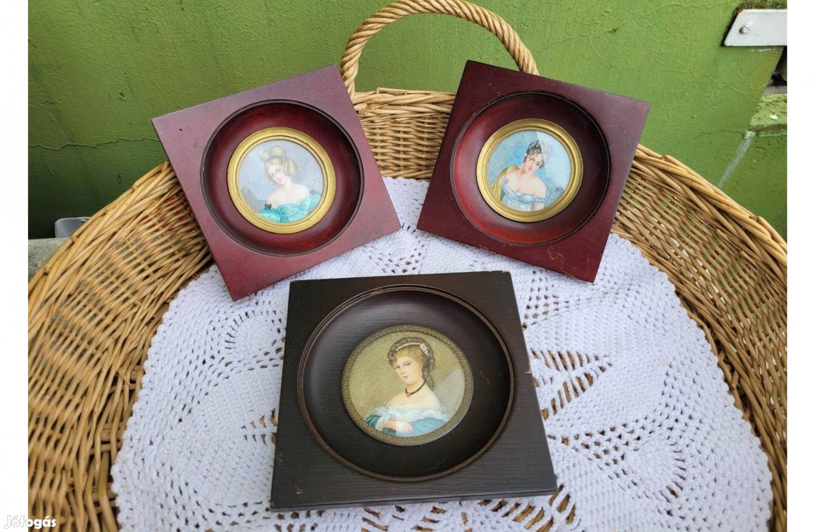Eladásra kínálom a képen szereplő Miniatűr festményeket 19.sz. vége francia női portrék fa keretben. A képek magukért beszélnek. Körbe fotóztam. A keretben réz üvegkeret, az üveg domború. Kézzel festett elefántcsontra 1849