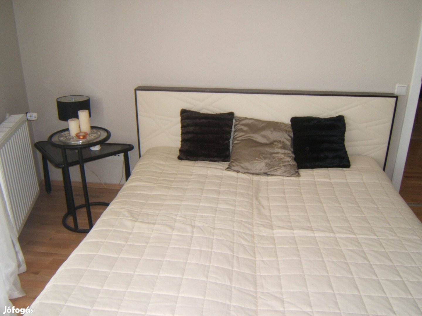 Az ágyrács mérete: 160x200 cm, ennek megfelelő méretű matraccal használható, az ágyrácsot a fejrészhez kell rögzíteni, ezenkívül van két oldalsó és egy ágyvég design elem is, ami körbeveszi az ágyrácsot. A fejtámla bézs színű textilbőr minimalista mintával. Olasz bútor. A fejtámla bal oldalán szállításból adódóan apróbb hibák fellelhetők, melyeket könnyen javítani lehet.