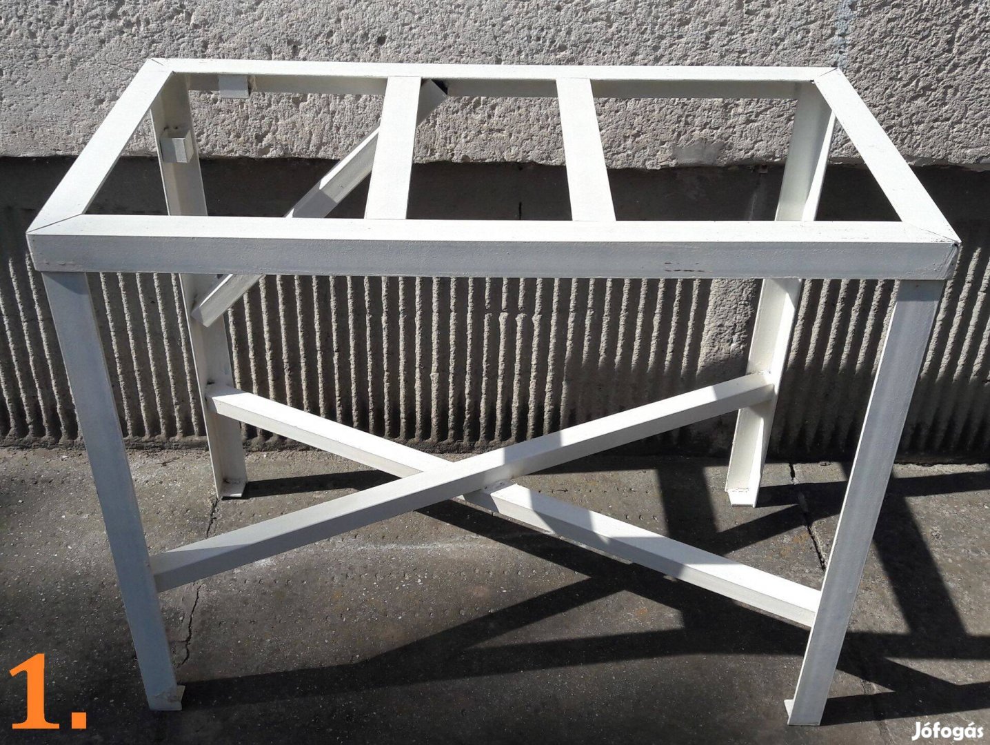 Eladó 8 darab, egyedi tervezésű, azonos méretű (106x55x85 cm magas) asztalos vagy lakatos gépasztal váz. Brutál masszív, ipari anyagminőség 50x50x5mm vastag szögvasból és 40x40x2mm vastag zártszelvényből vannak az alsó keresztmerevítők, lábak alján 5mm laposvas. Egy asztal kb.36kg!!! Így nem rezonálnak, nem rezegnek be, ellentéteben a bolti lemez asztalokkal. A vázak kifejezetten asztalos kézi kisgépek (felsőmaró, körfűrész, dekopír, szalagos csiszoló, gyalu, stb..) asztalba építéséhez és telepítéséhez készültek. De használható satupadoknak, gépműhelyekbe hegesztő asztaloknak, stb...