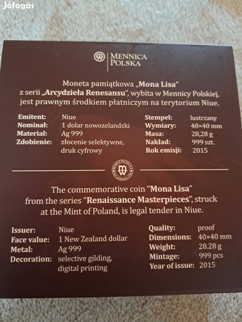 A Reneszánsz remekművek sorozatból származó, a Lengyel Pénzverdében veretett, Mona lisa 28 gramm ezüst emlékérem. Hibátlan, dobozában eladó.