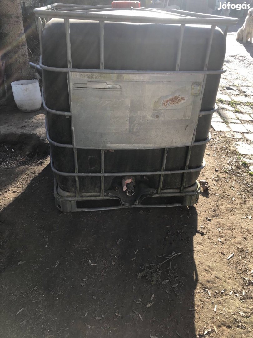 Eladó a képen látható műanyag 1 m3 - és tartály használt acél lábas keretben csappal és cca 4-5 m hosszú 5/4-és flexibilis műanyag csővel