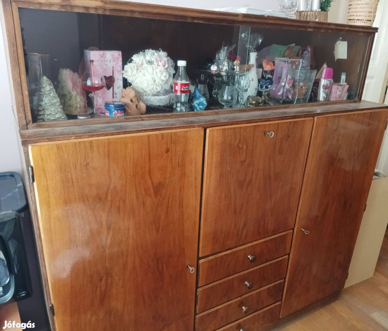 Múltszázad elején készült vitrines és kétajtós akasztós szekrények ingyen elvihetők. A vitrines eleje felújításra kerül a képeken látható módon. A kétajtós baloldalán, a vitrines tetején az intarzia sérült. A két szekrény lehetőség szerint egyben vihetők el. A szállítás vevő feladata.