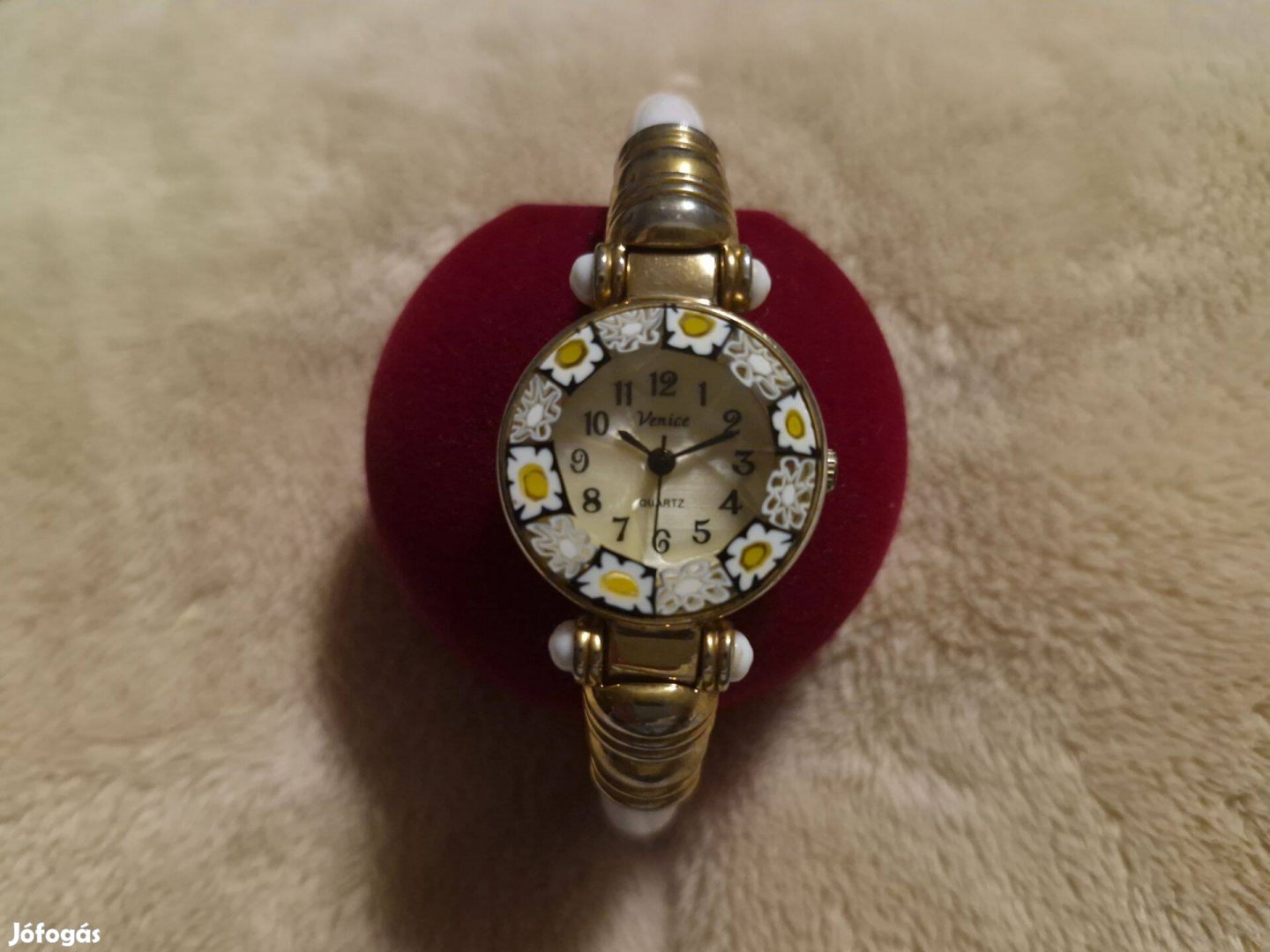 A képeken látható állapotban eladó ez a finom, nőies muránói üveg karóra. Minimális kopás van az arany színű részek némelyikén, de ott is fényes maradt, ezért nem zavaró.