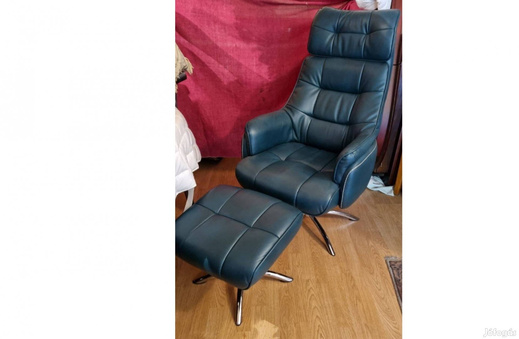 Elegáns minőségi dizájner fotel lábtartóval rögtön lakásba rakható szép állapotban, lásd fotók. 115cm magas, 70 cm széles, 70 cm mély, ülőmagasság 47 cm.