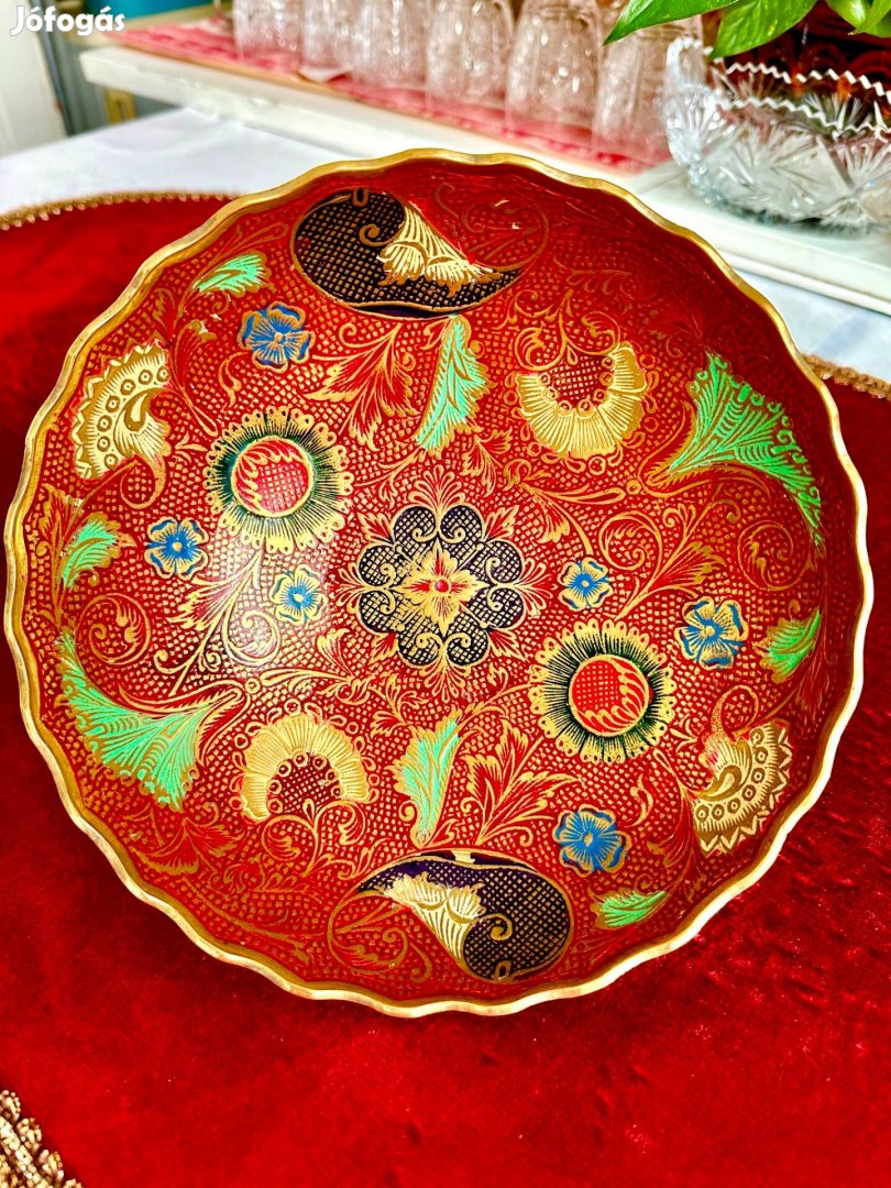Mutatós szépen cizellált és festett indiai réz kínáló tál, átmérője 20 cm.