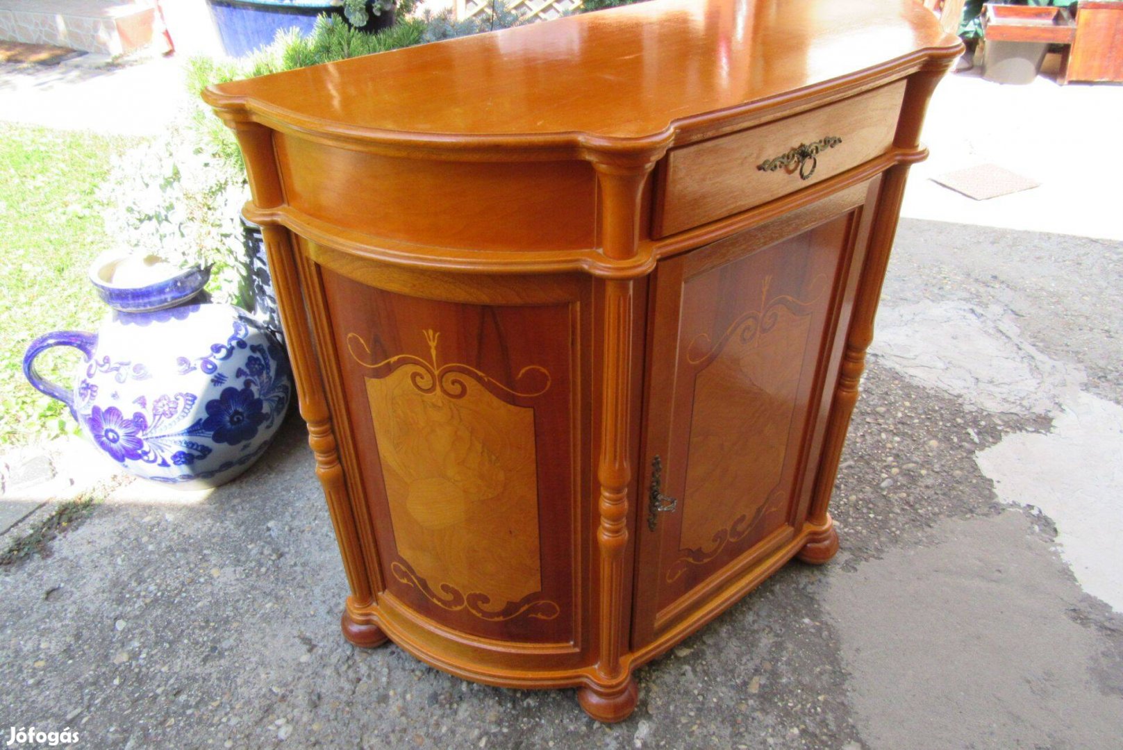 Elegáns 1 fiókos 1 ajtós intarziás komód , stabil fa szerkezettel, szép állapotban, lásd fotók. 90 cm magas, 100 cm széles ,40 cm mély.