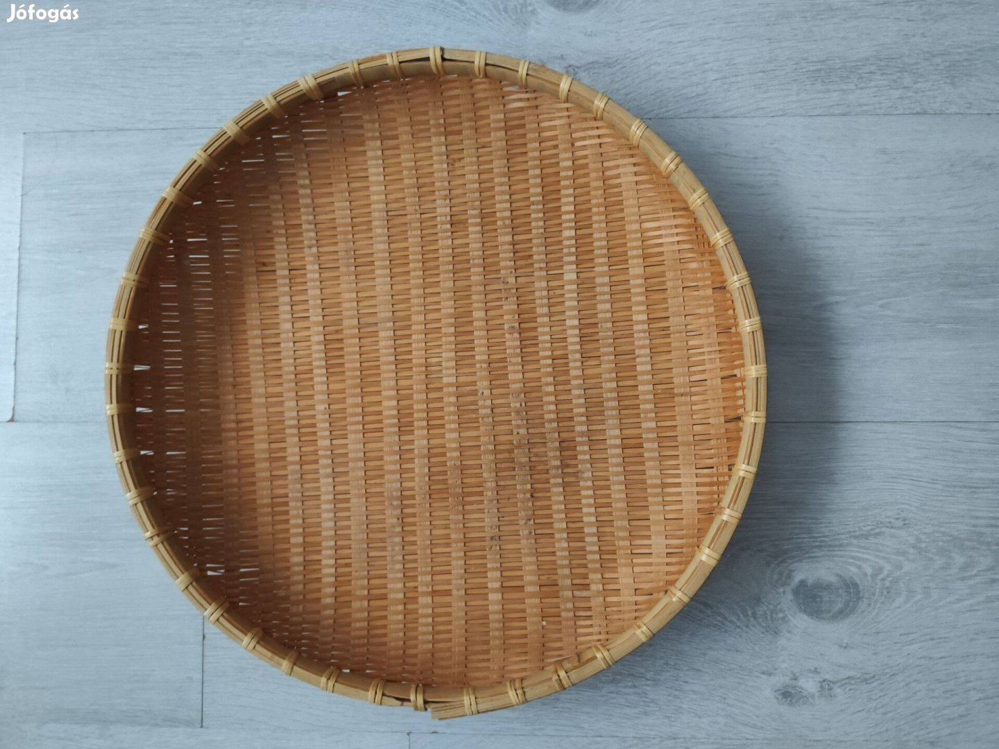 Képeken látható, 37 cm átmérőjű, kör alakú tároló, kínáló, fonott kosár.
