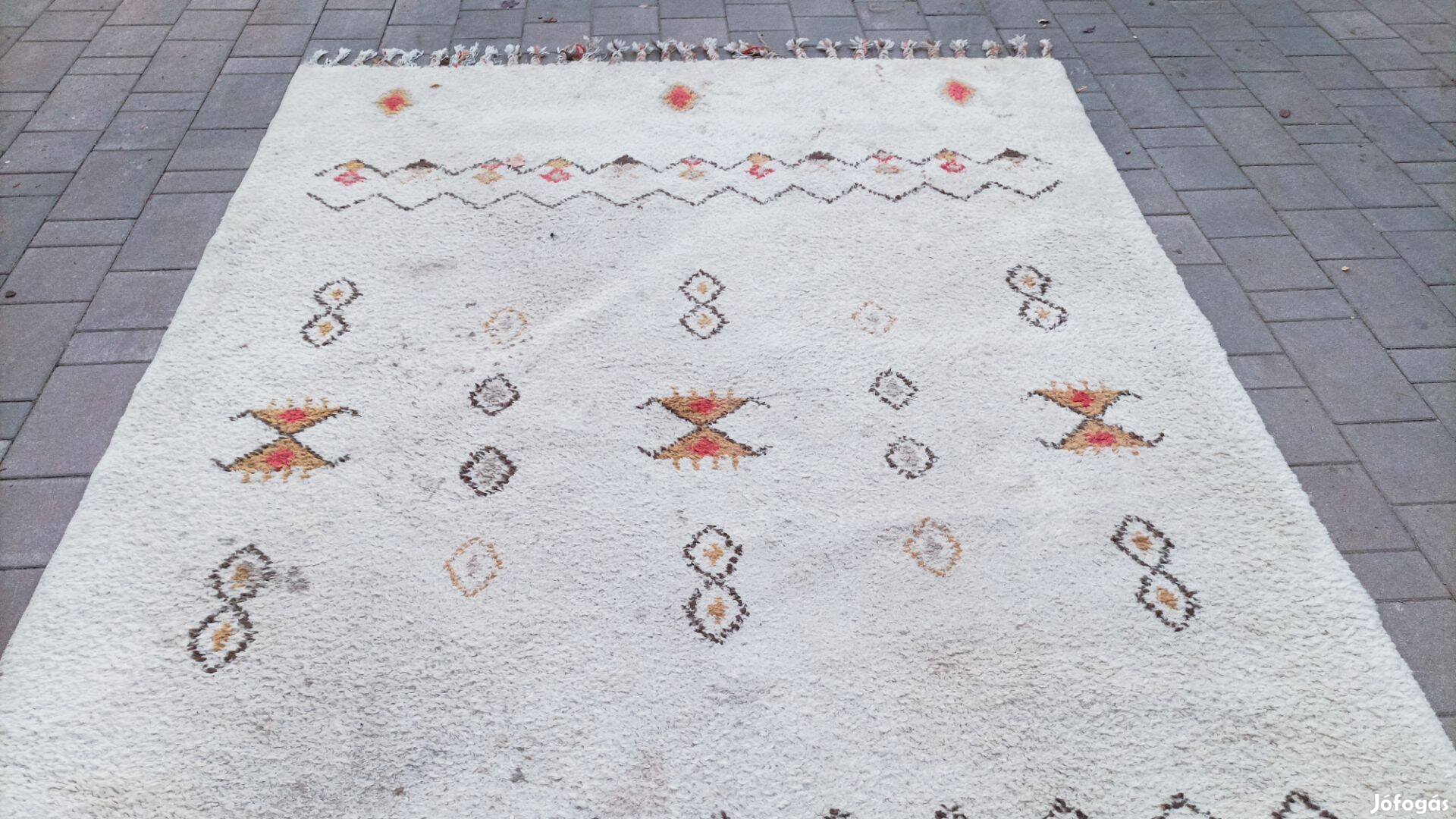 Nagyméretű fehér alapon geometrikus formákkal díszített szőnyeg, állapota korának megfelelő, tisztítást igényel. Átvétel Zugló.