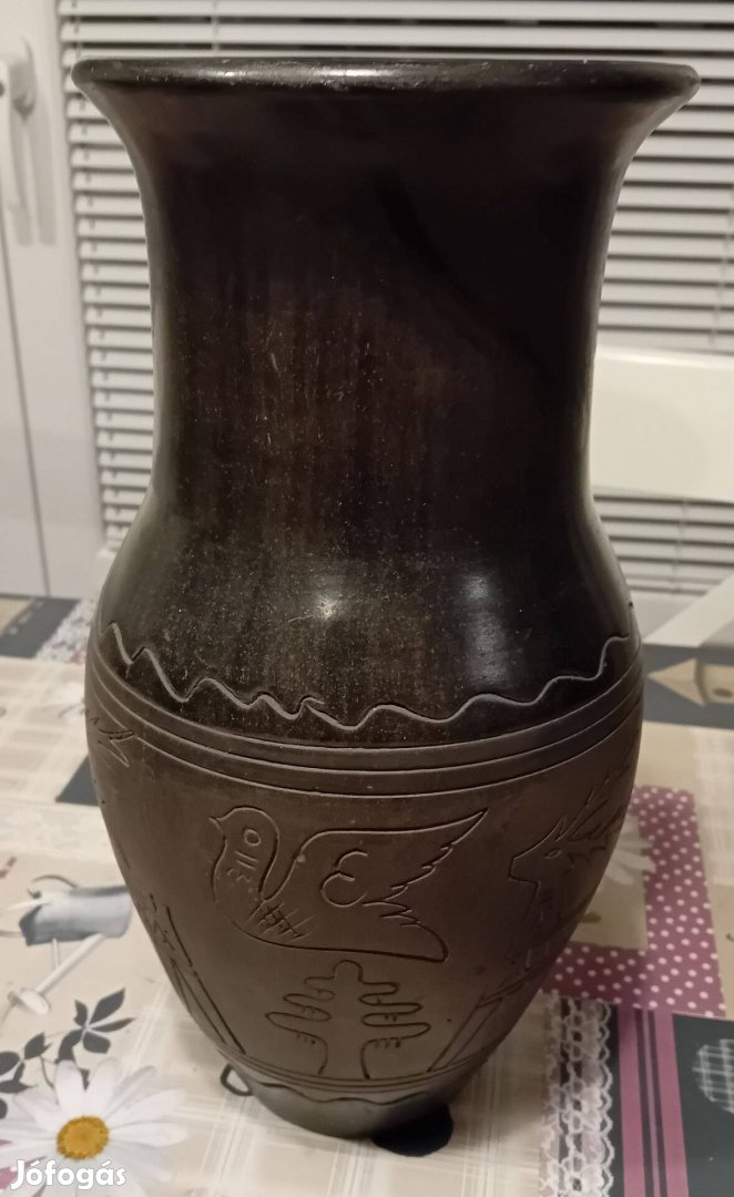 Hibátlan állapotú, jelzett nagy méretű (33 cm magas) fekete cserép kerámia váza. Oldalán szarvas és madár diszitések láthatóak.