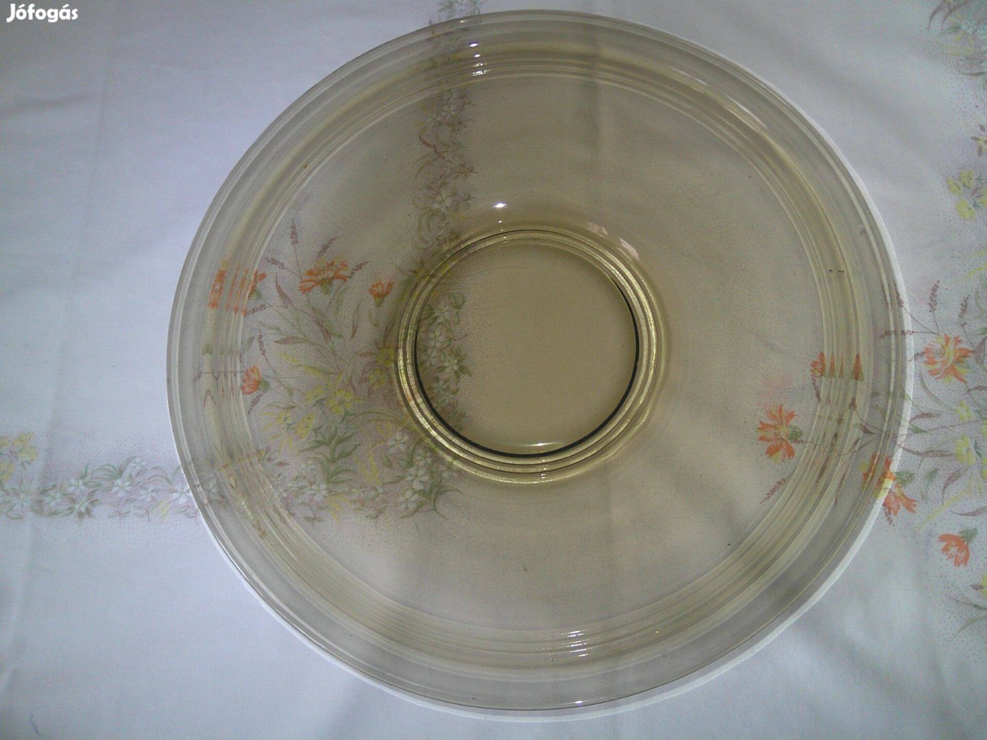 A képen látható nagyyobb méretű üveg tál, asztalközép eladó. Alsó felületén apró lepattanás látható, lásd fotó.