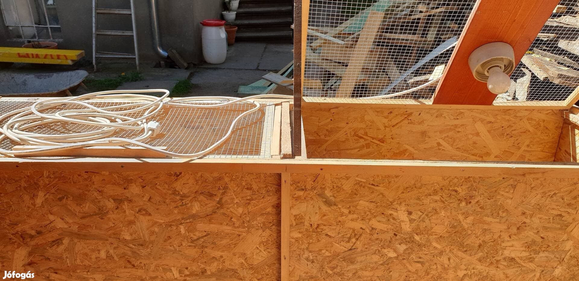 Napos csibék neveléséhez tárolódoboz, anyaga OSB lap, világítással, infralámpával. Középső elválasztó falap kiszedhető ezért amíg kicsik a csibék csak az egyik felébe vannak, utána nagyobb hely van nekik. Más kisállatoknak is alkalmas lehet.Teteje rácsos, mindkét oldalon nyitható. Mérete: sz:60cm m:50cm h:195cm BP. XVI kerületben tekinthető meg.