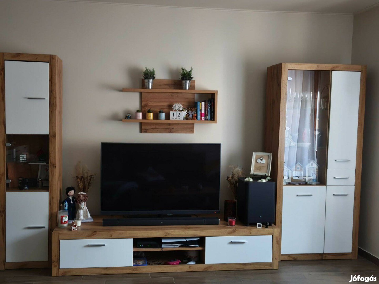 Eladó a képeken látható, stílusos és praktikus nappali bútor összeállítás. Letisztult, modern megjelenésű, természetes fa hatású és fehér kombinációban, amely bármely nappaliba elegáns megjelenést biztosít.