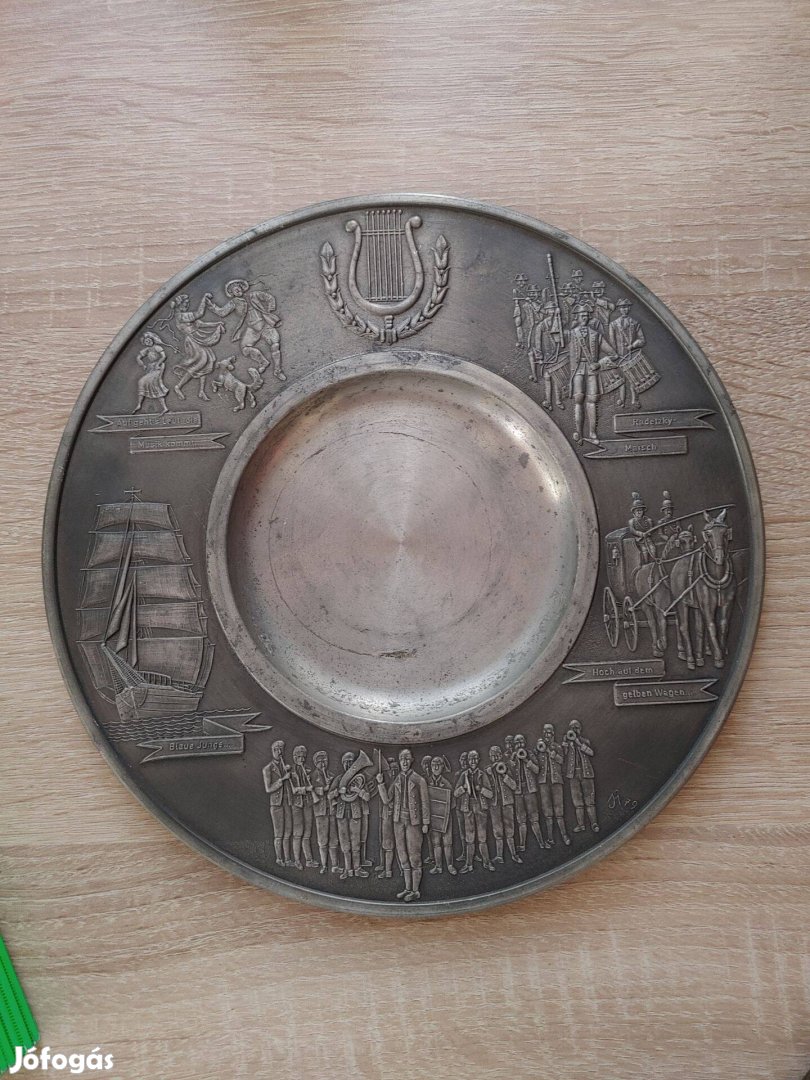 Német fém dombor mintás falitányér, vagy hamutál vitorlás, lovaskocsi