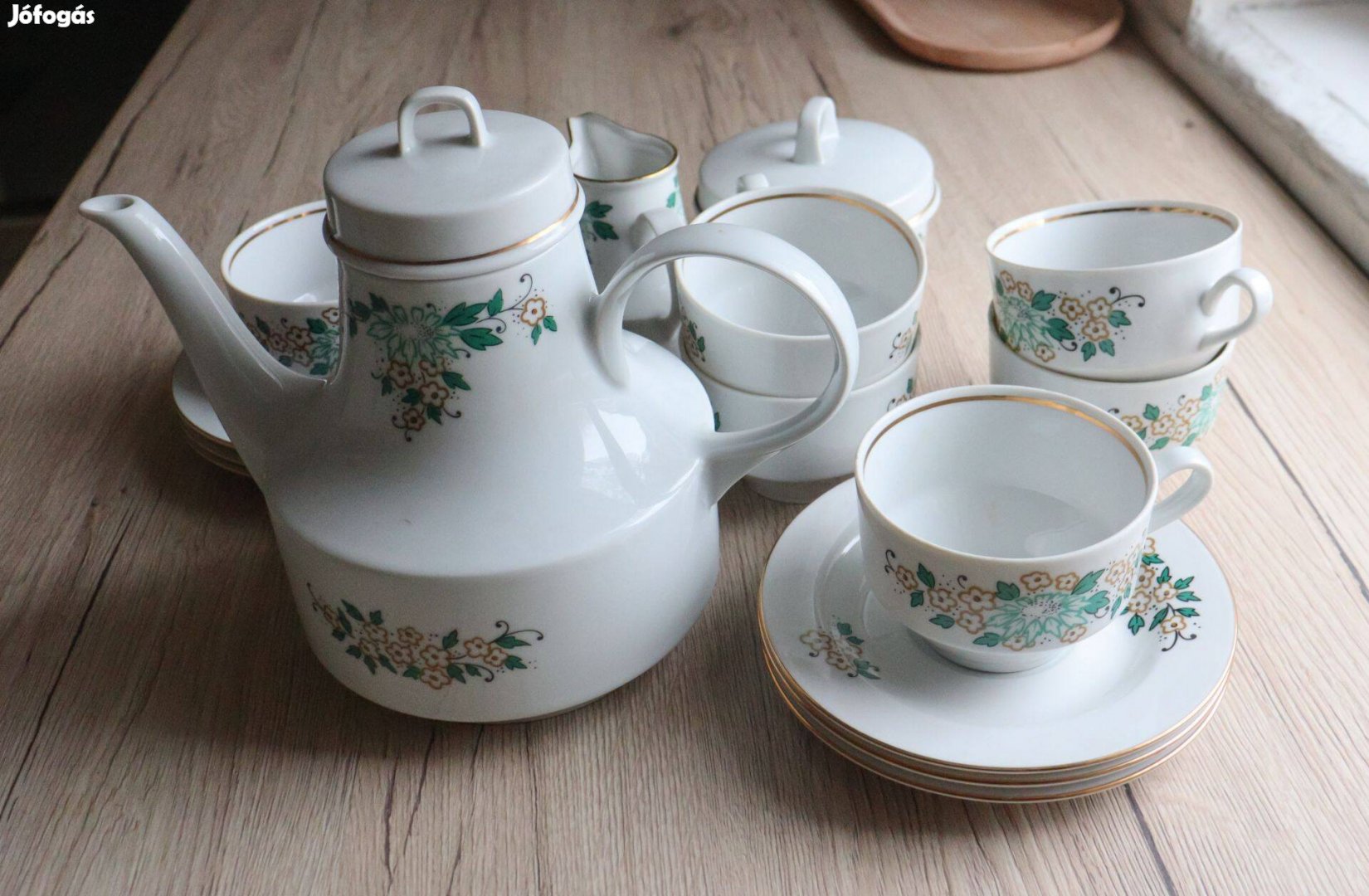 6db csésze, 6db csészealj, 1 cukortartó, 2 kancsó, az egyik fedeles.