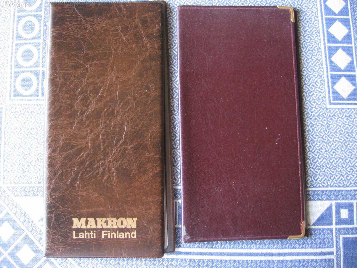 Egy barna 11,5 x 21,5 cm, és egy bordó színű 12 x 22,5 cm, melynek felületén két helyen kisebb kopás van. A barna: 96 db 9 x 5,5 cm-es, a bordó 72 db 10 x 6,5 cm-es névjegy részére.