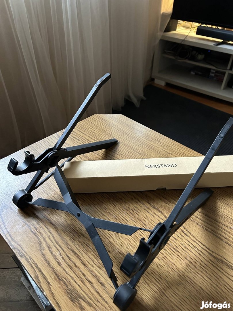 Nexstand K2 összecsukható laptop állvány, kiváló állapotban. Alig használt, minimális használati nyomokkal. Megerősített máanyag váz, több fokozatban állítható magasság, amely lehetővé teszi a képernyő szemmagasságba emelését az ergonomikus munkavégzéshez. Max. 9 kg teherbírás, 11,6"-17" laptopokhoz használható. Nyitott kialakítása segíti a laptop szellőzését. Összecsukva kompakt, könnyű - táskában, hátizsákban könnyen elfér. A szett tartalmazza az eredeti dobozt, a Nexstand hordozótokot és az állványt. Otthoni és irodai munkához, utazáshoz egyaránt praktikus kiegészítő - külső billentyűzettel párosítva ideális ergonomikus munkaállomás alakítható ki.