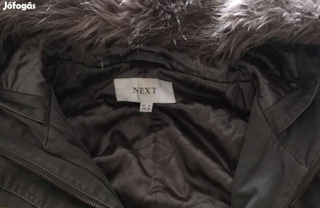 Szőrmés kapucnis, zsebes, khakizöld színű, kényelmes Next kabát, Hátul kicsit hosszított, bélés steppelt.