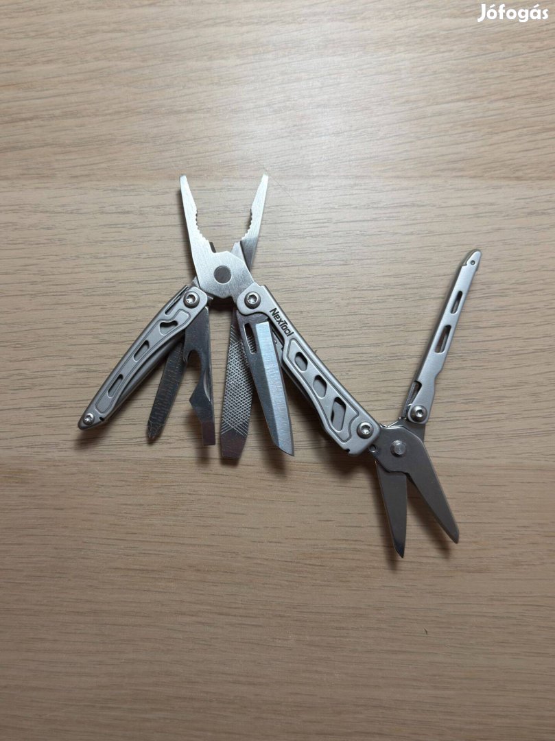 Funkciók: kés, fogazott olló, fogó, csípőfogó, vezetékvágó, reszelő, lapos csavarhúzó, Phillips csavarhúzó, sörnyitó, mérőskála, kulcskarikás rögzítés