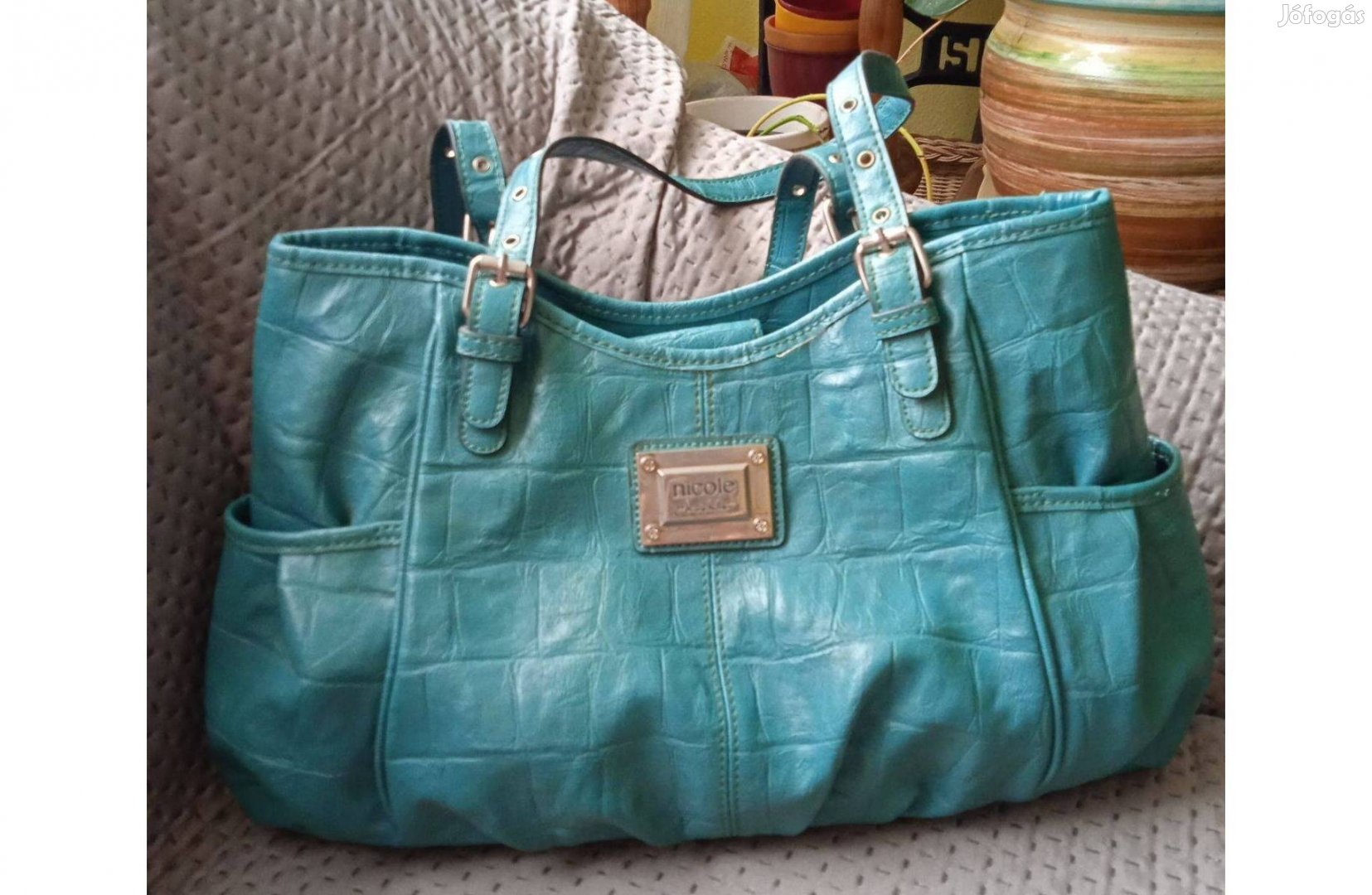 Használt, de nagyon jó állapotú, jó minőségű, türkiz színű, pakolós, bőr válltáska eladó. Belül 3 nyitott és egy cipzáras zsebe, kívül egy cipzáras és a két végén egy-egy nyitott zsebe van.