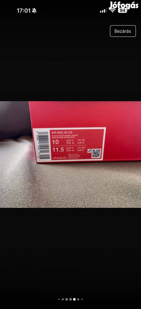 Eladó a képeken látható Limitált, makulátlan állapotú Nike Air Max 90 típusú cipő 44-as méretben. Egyszer sem volt a lábamon. Eredeti Nike oldalról lett rendelve, számla is van hozzá. A mérete sajnos nem lett jó, ezért szeretném eladni.