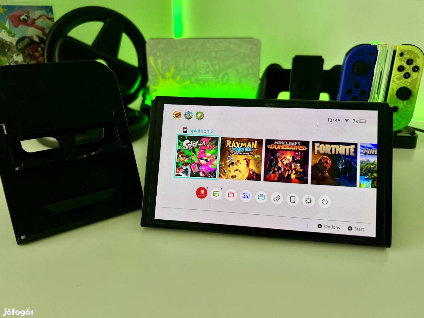 Eladó Nintendo Switch OLED Splatoon 3 Edition konzol, hibátlan működéssel. A készüléken a kezdetektől fogva kijelzővédő fólia van, amely jelenleg is rajta van. A csomag tartalmazza a komplett gyári tartozékokat (dock, töltő, HDMI kábel, Joy-Con kontrollerek és grip), valamint több kiegészítőt is: ajándék Splatoon 2 játék, Orzly Joy-Con töltőállomás, egy pár Orzly Nintendo kormány és egy Venom LED világítós állvány, továbbá egy 256 GB microsd kártya is jár hozzá. A készülék szép állapotú, azonnal használható.