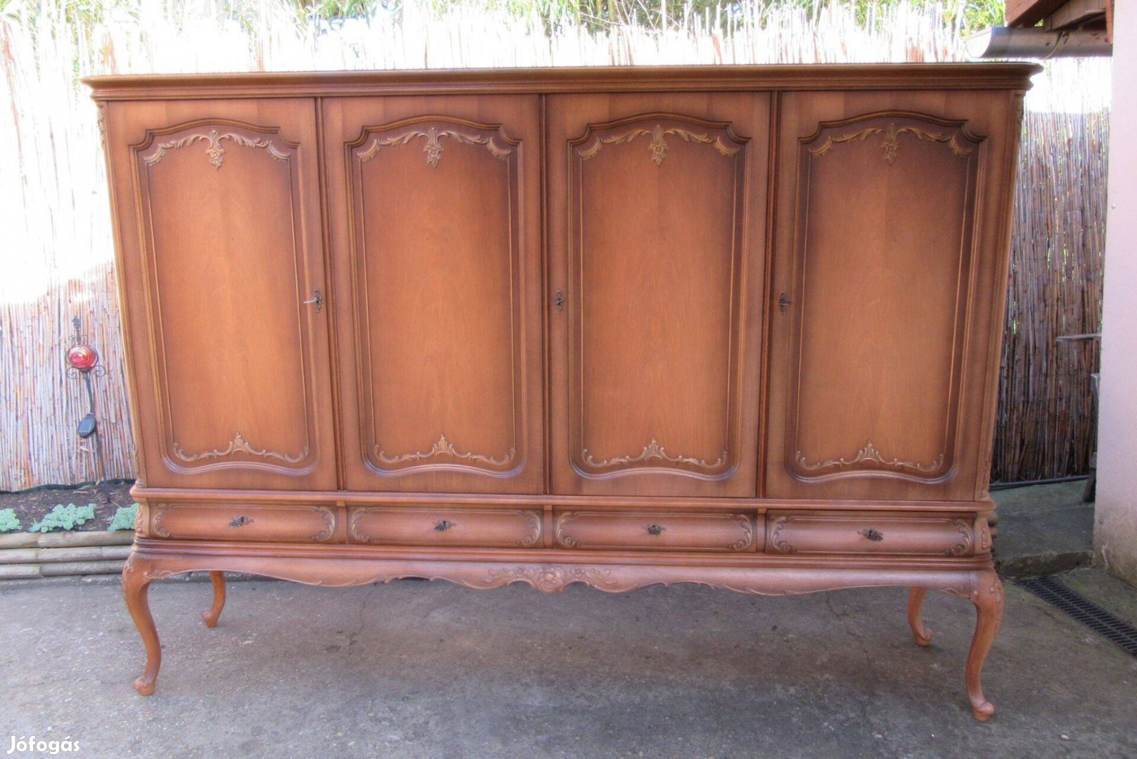 Elegáns neobarokk 4 ajtós,4 fiókos szekrény-vitrin,belül 6 db. polccal szép, rögtön lakásba rakható állapotban, lásd fotók. Kb: 210 cm széles, 40 cm mély, 150 cm magas.