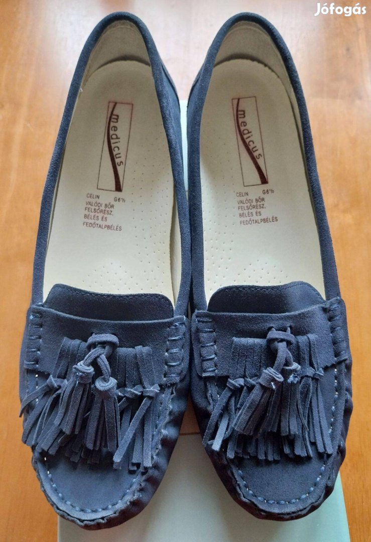 Újszerű állapotban, egyszer használt sötétkék bőr Medicus márkájú, könnyű gyógymokaszin, méret probléma miatt eladó.