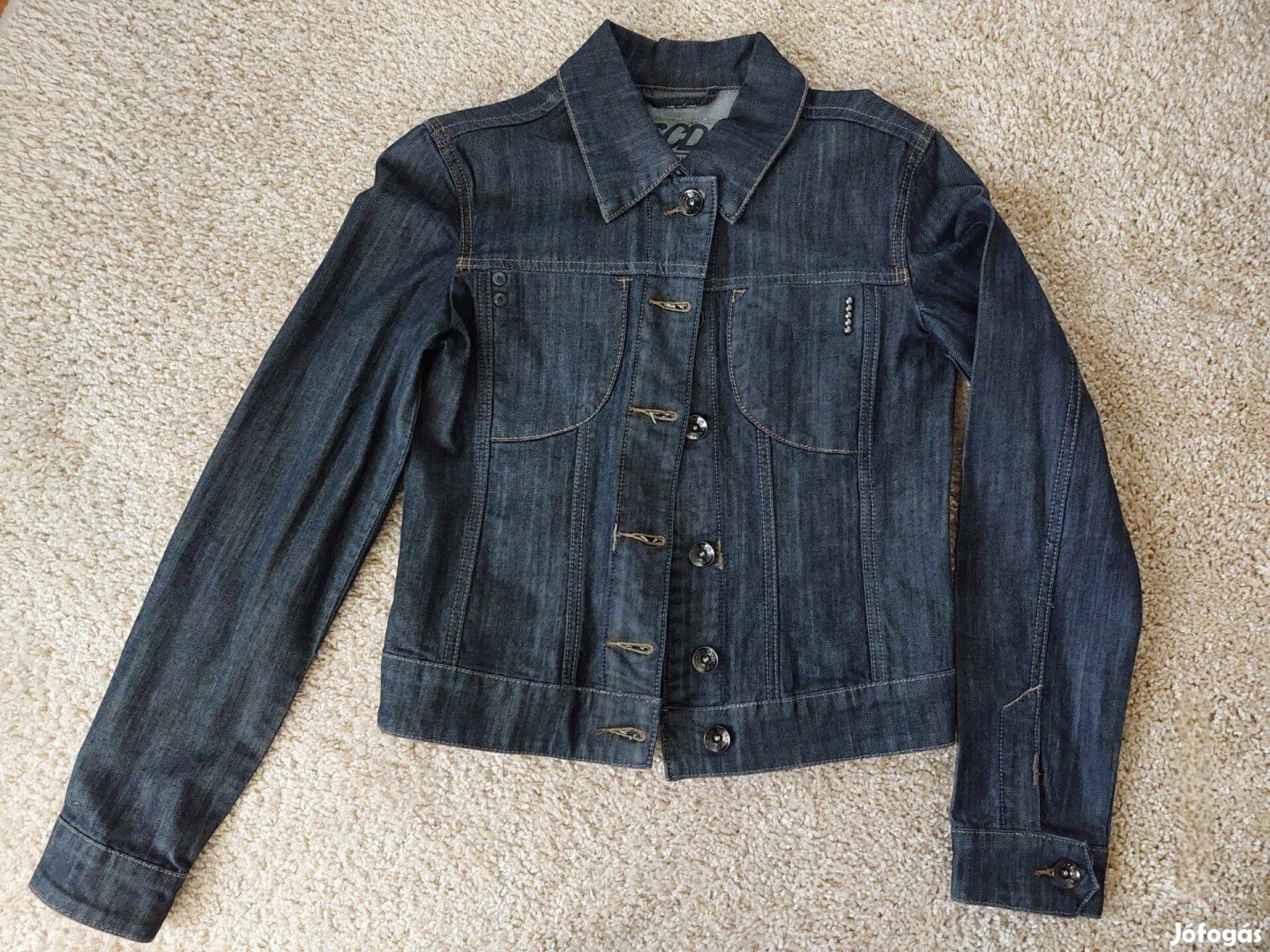 Eladó a képen látható sötétkék női farmerkabát.