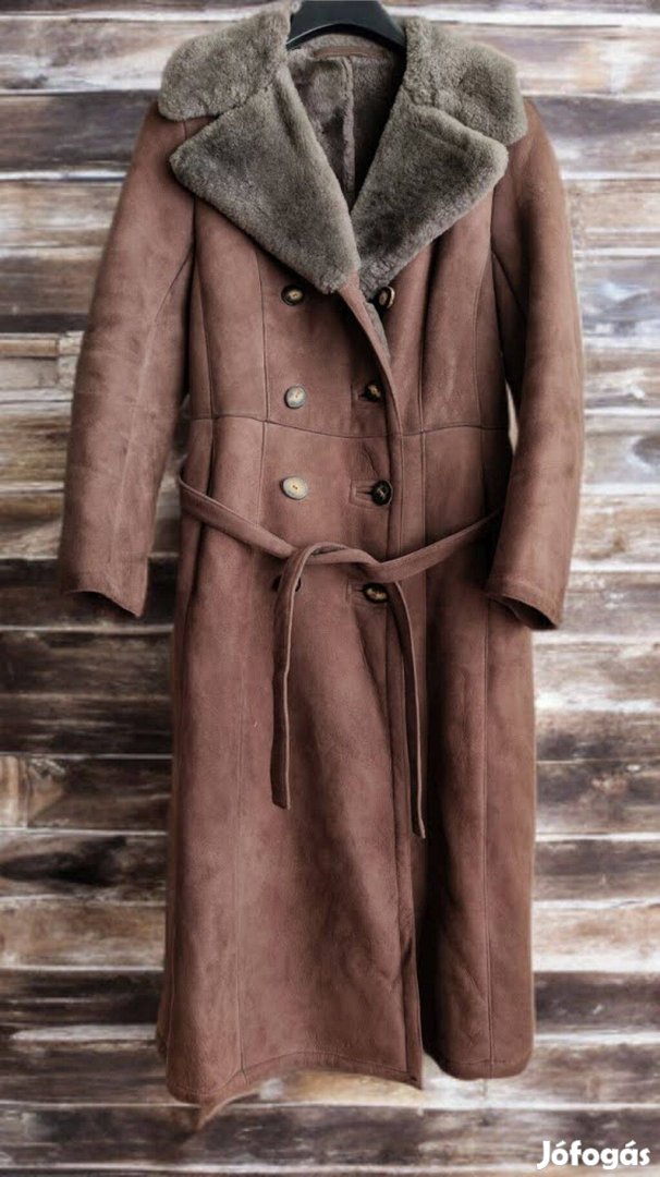 Ideális választás hideg téli napokra, napi vagy alkalmi viselethez, egyszerre időtlen és elegáns. Kívül puha, barna velúr felület, belül sűrű, meleg prém, dupla gombolással és övvel.