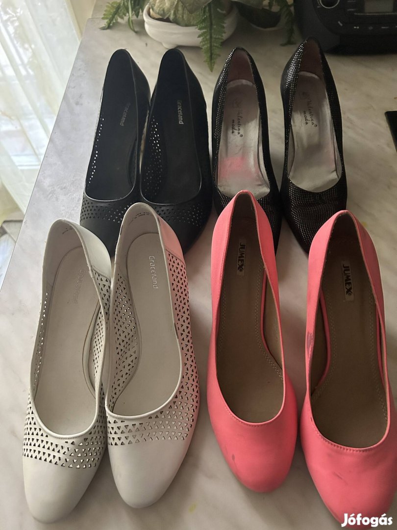 4 pár cipő: Graceland: 40-es fekete és fehér vastag magas sarkú, pink 41-es Yumex, tűsarkú. fekete fényes tűsarkú 39-es.
