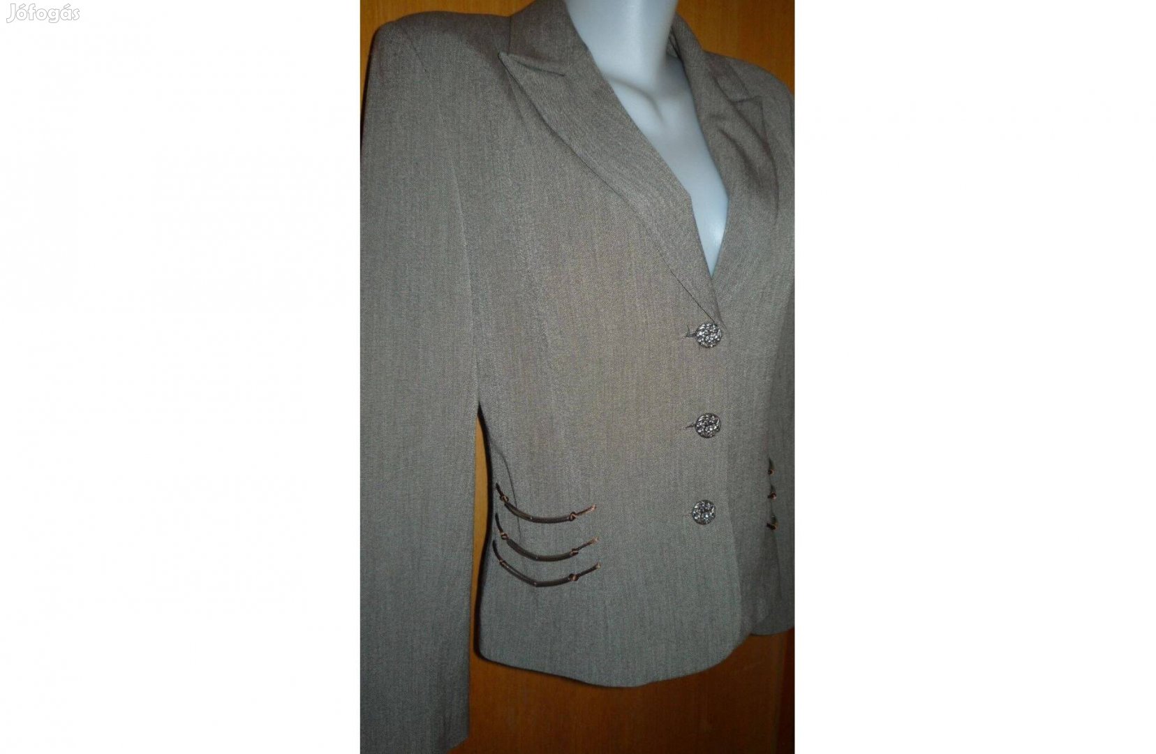 Eladó a képen látható szürkés-zöld színű női nadrág kosztüm, különleges gombokkal és fazonnal. Újszerű állapotban van, néhány alkalommal volt csak viselve. Beleírt méret 36, de kisebb 38-as méretre is megfelelő. Nagyon szép alkalmi viselet.