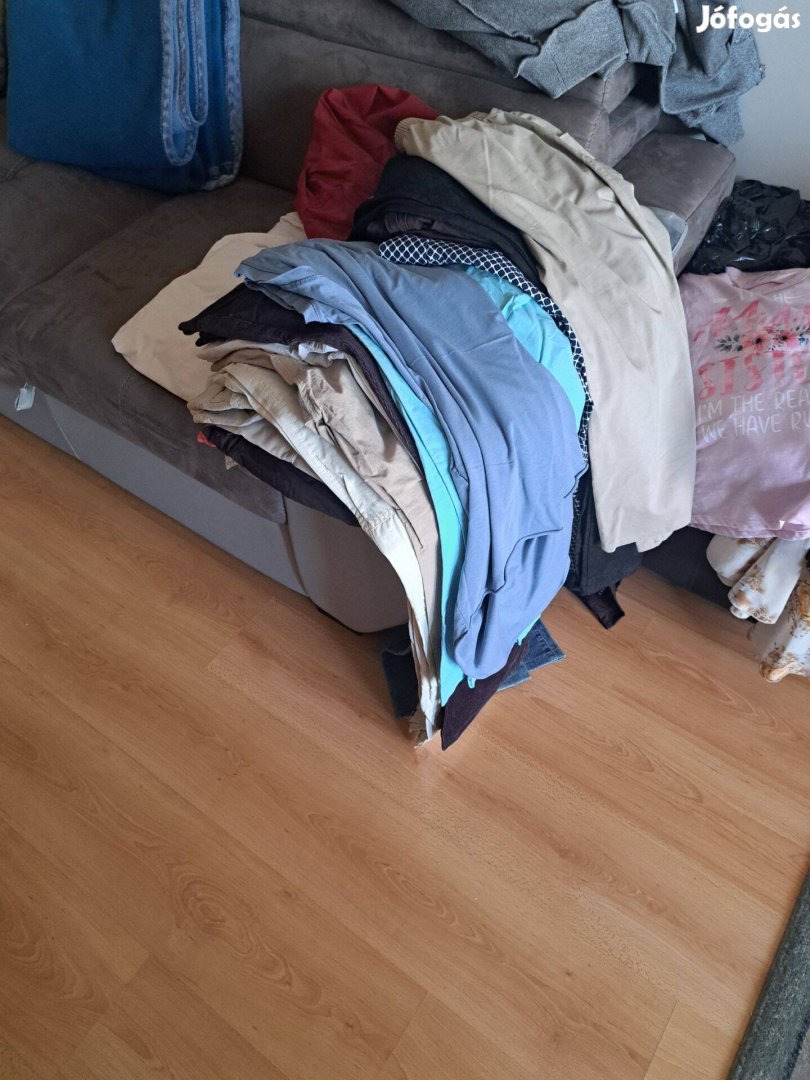 sziasztok feleségem ruháit átválogattuk sikerült 3 nagy zsákkal összeszednie vegyesenvan benne minden sok nadrág hosszu háromnegyedes farmer és szövet is van egy zsák fekete ruhákkal is az xl-töl bezárolag az xxl-ig . bluzok polok kabátok tényleg mindenféle ruha eddig szekrénybe voltak nem a pincébe postázni nem tudom a mennyiség miatt ha valakit érdekel személyessen eltud jönni érte.