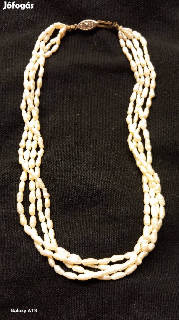 Elegáns klasszikus 4 soros valódi édesvízi tenyésztett gyöngy nyaklánc,rizsgyöngy barokk jellegű