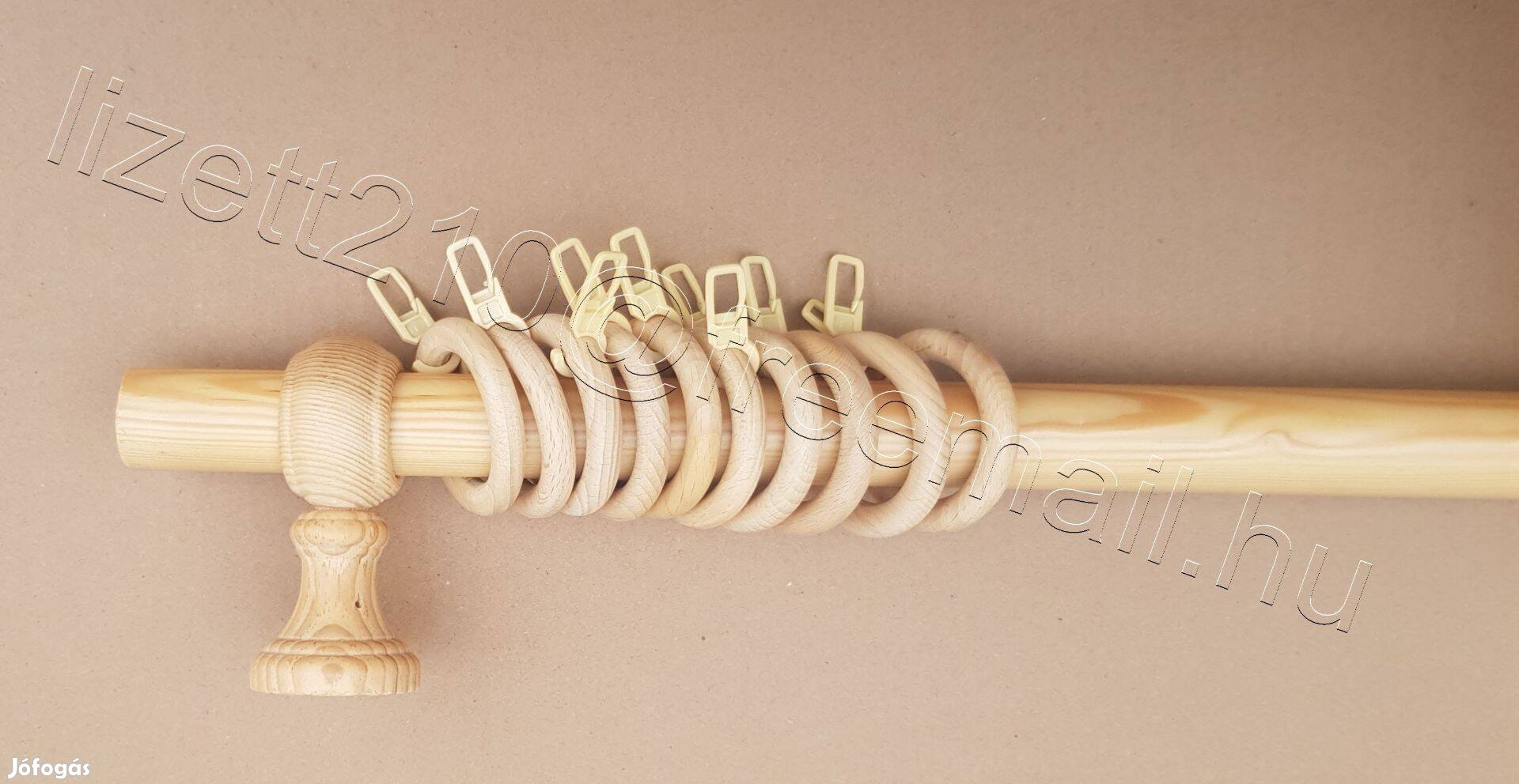 Eladó a képen látható fa függönykarnis, függönyrúd függönykarikával együtt erdeifenyő színben.