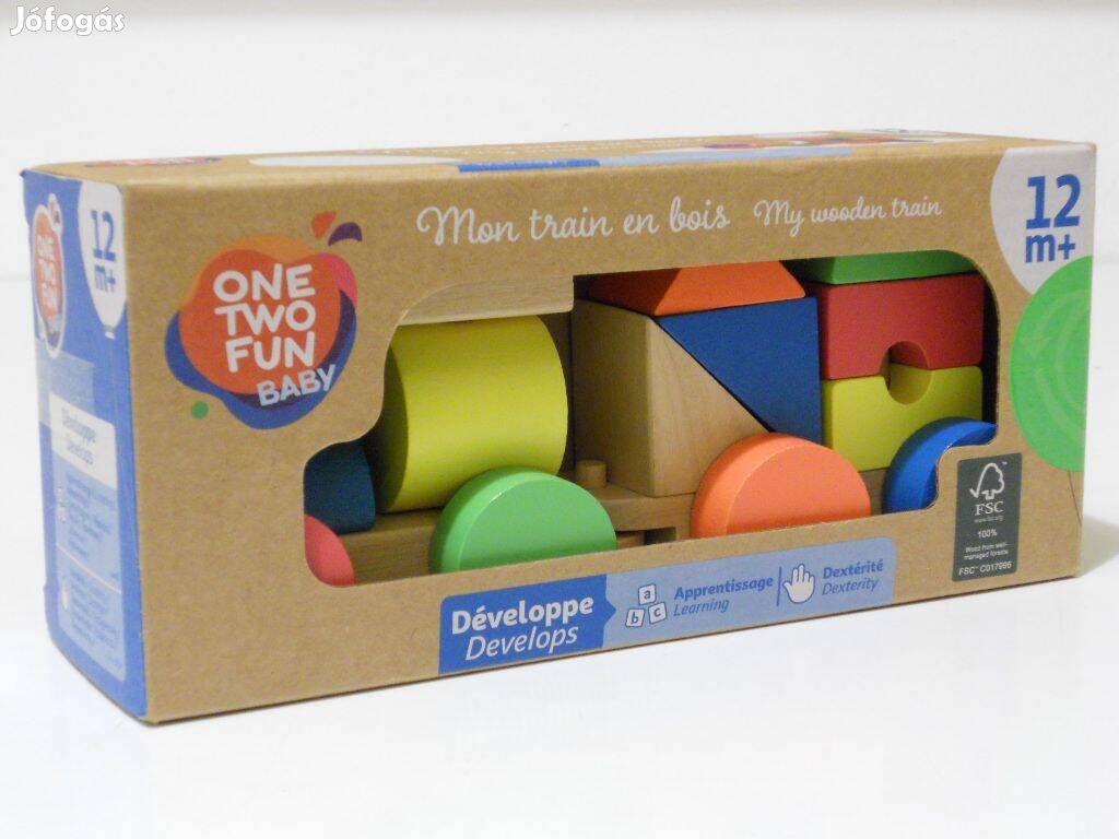 Új 'ONE Two Fun My wooden train' 20cm hosszú építőkockás fa kisvonat eladó.
