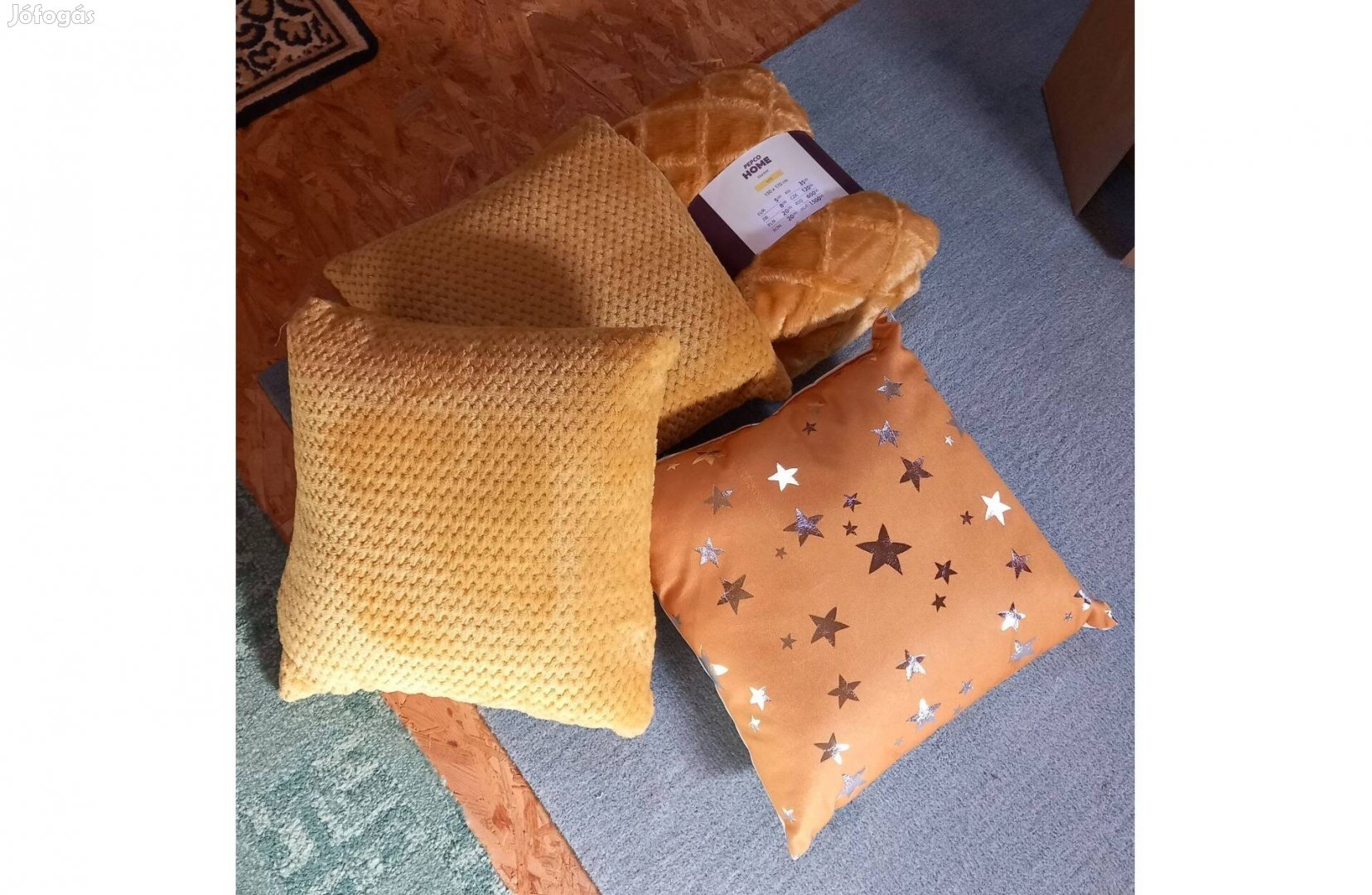 Okker sárga plüss takaró és párna, asztali futó szett - Új