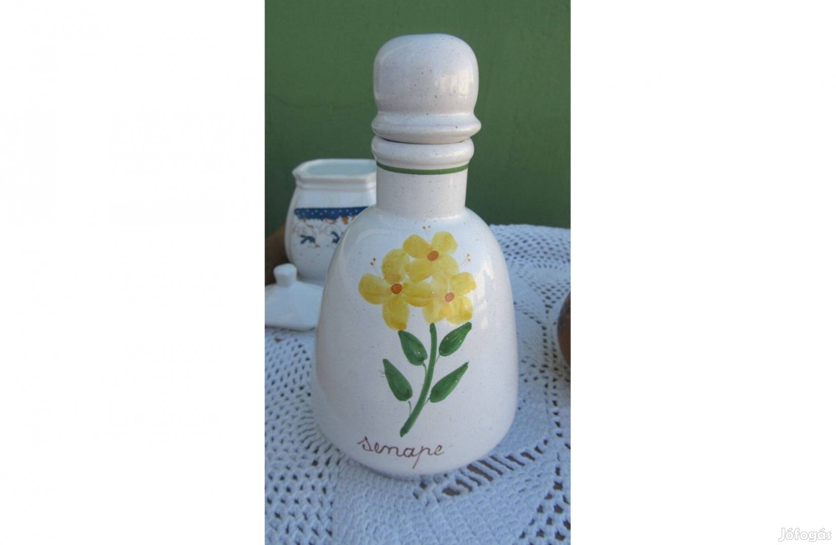 Eladásra kínálom a képen szereplő olasz mázas kerámia fűszer tartót, mustármag tartót. A képek magukért beszélnek. Körbe fotóztam. Kézzel festett, szép, jelzett, a dugó is kerámia, szélén kis lepattanás, belül egy darabka letörött, képeken látszik...