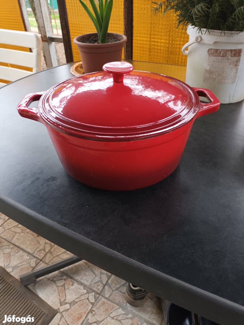 Öntötvas fazék/lábas fedővel, újszerű állapotban, zománcozott, piros. Átmérő kb 27cm, magassága kb 14cm. Új ára 25.5eFT.